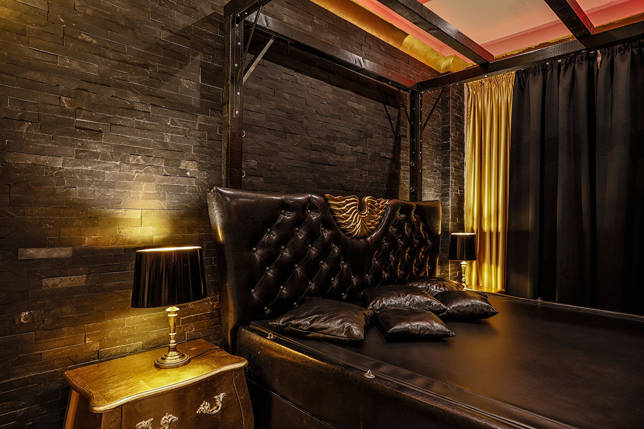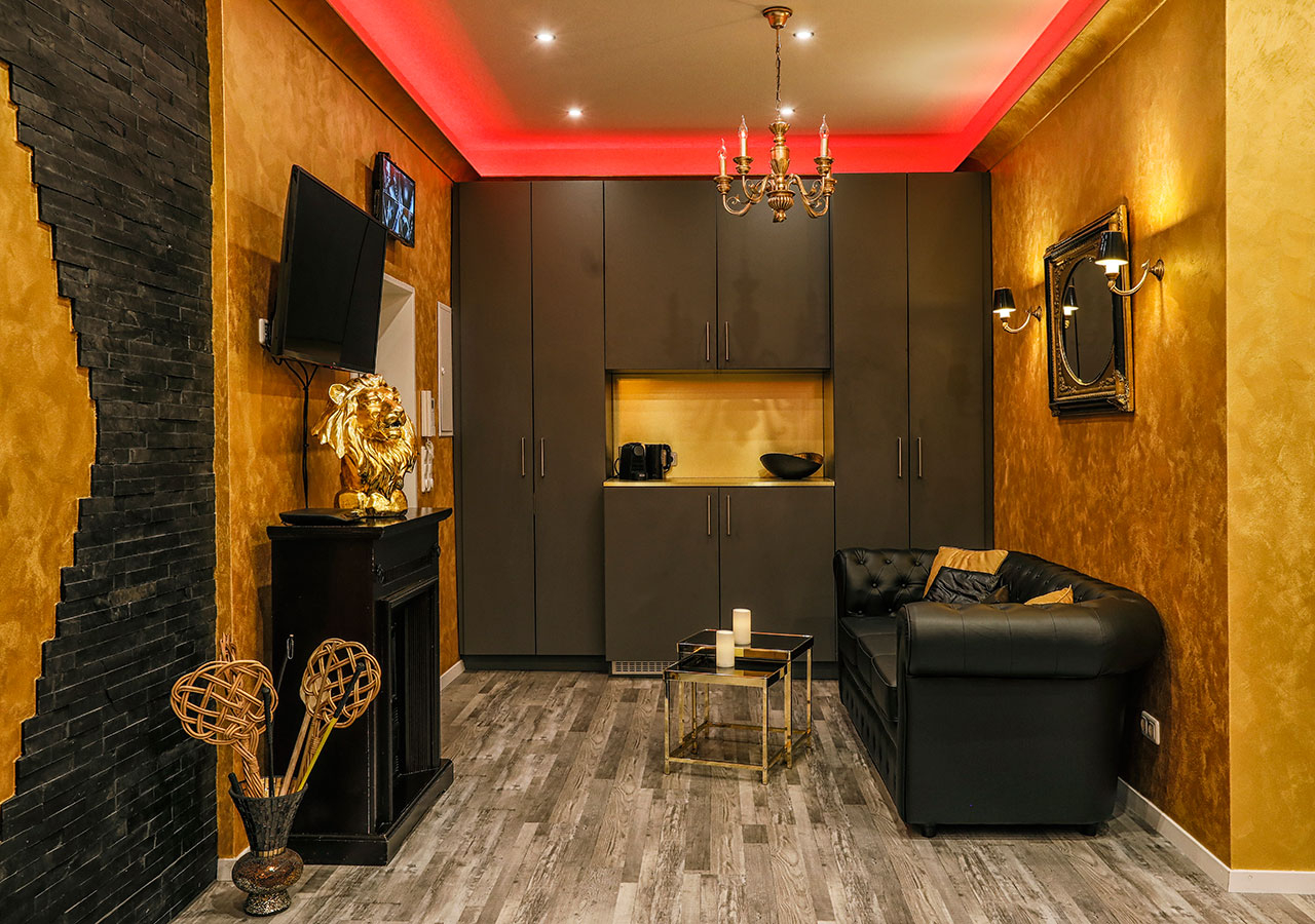 Für Liebhaber der erotischen Momente ist dieses goldene Fetisch Apartment mit einem besonderen Flair und Glamour ausgestattet. Es wurde mit viel Liebe zum Detail gestaltet. Indirekte Beleuchtung und entspannende Musik sorgen für die richtige Stimmung der besonderen Stunden. Hier verwöhnen unsere Fetisch-Gespielinnen Dich nach allen Regeln der Liebeskunst. Der große Decken- und Wandspiegel bringt den einzigartigen Kick beim Liebesspiel.