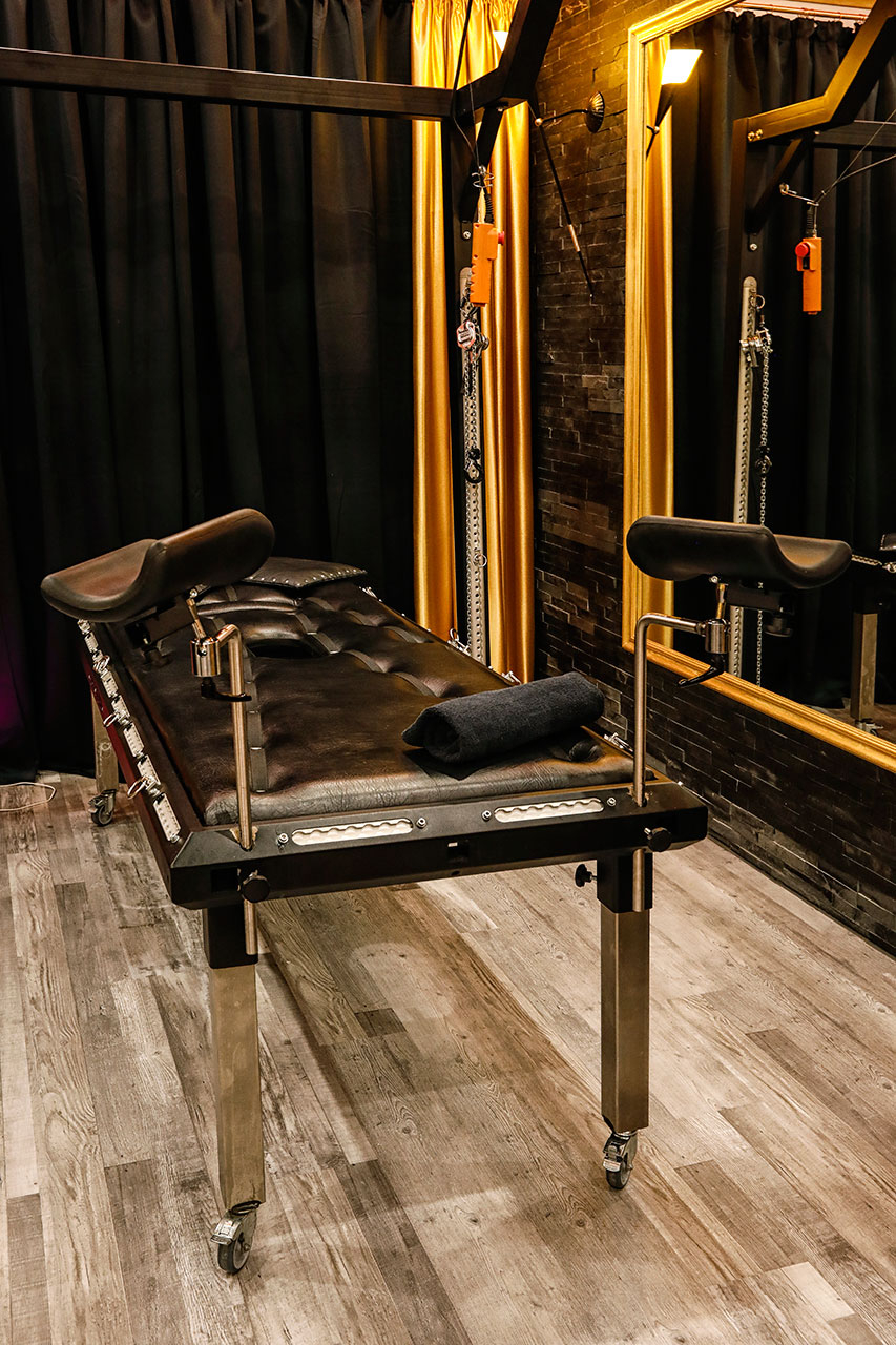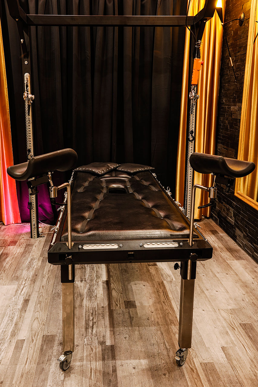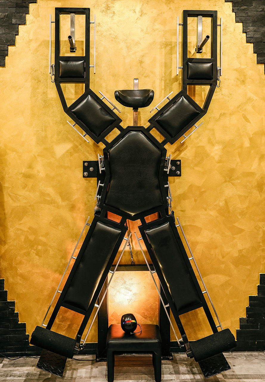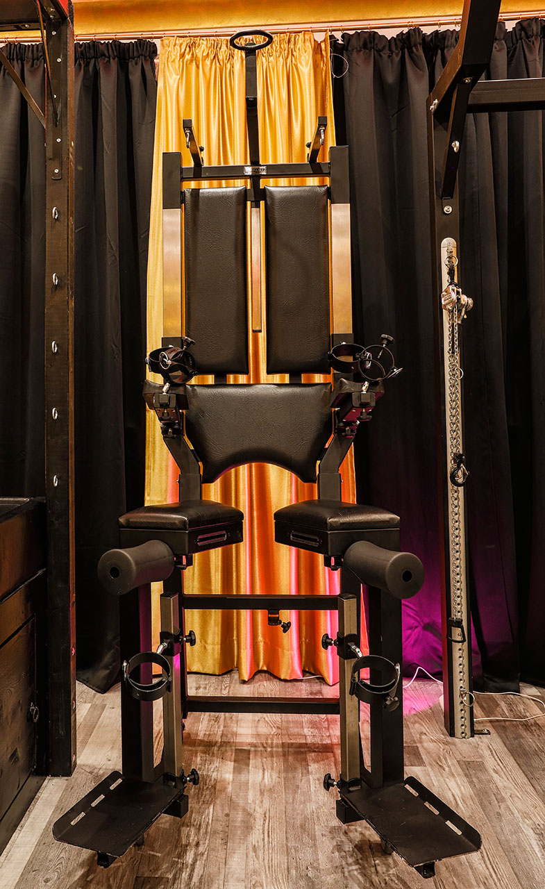 Kurzer Auszug unserer Ausstattung: Sklavenstuhl, Strafbock, Bondage-Konstruktion, drehbares Andreaskreuz (360 Grad), Fessel-Bette, Spreizstange, Toilettenstuhl, Gynstuhl, Fixierungsliege, Elektrischer Flaschenzug und vieles mehr.
